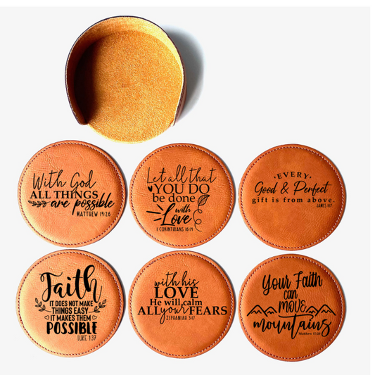Inspirational Round Leather Coasters with holder (Set of 6)